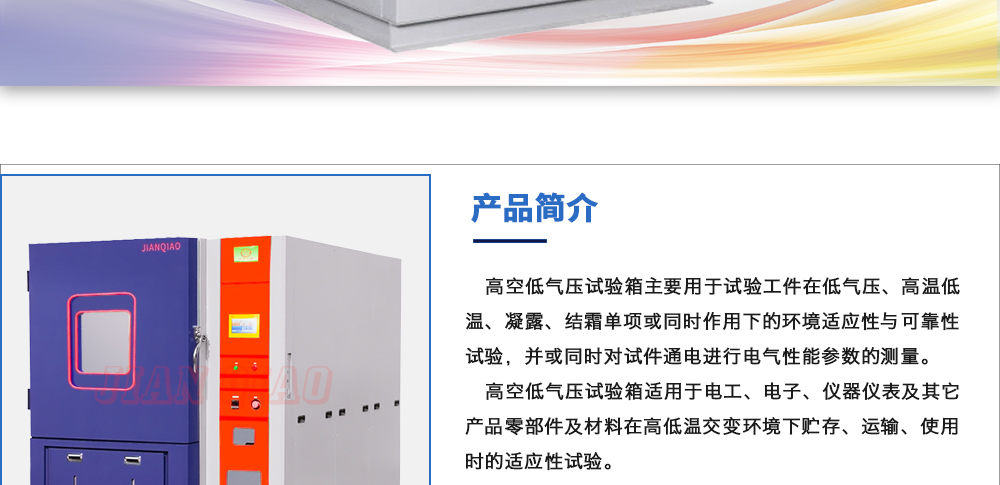 用途:高低溫低氣壓試驗箱主要用于試驗工件在低氣壓、高溫低溫單項或同時作用下的環境適應性與可靠性試驗,并或同時對試件通電進行電氣性能參數的測量。