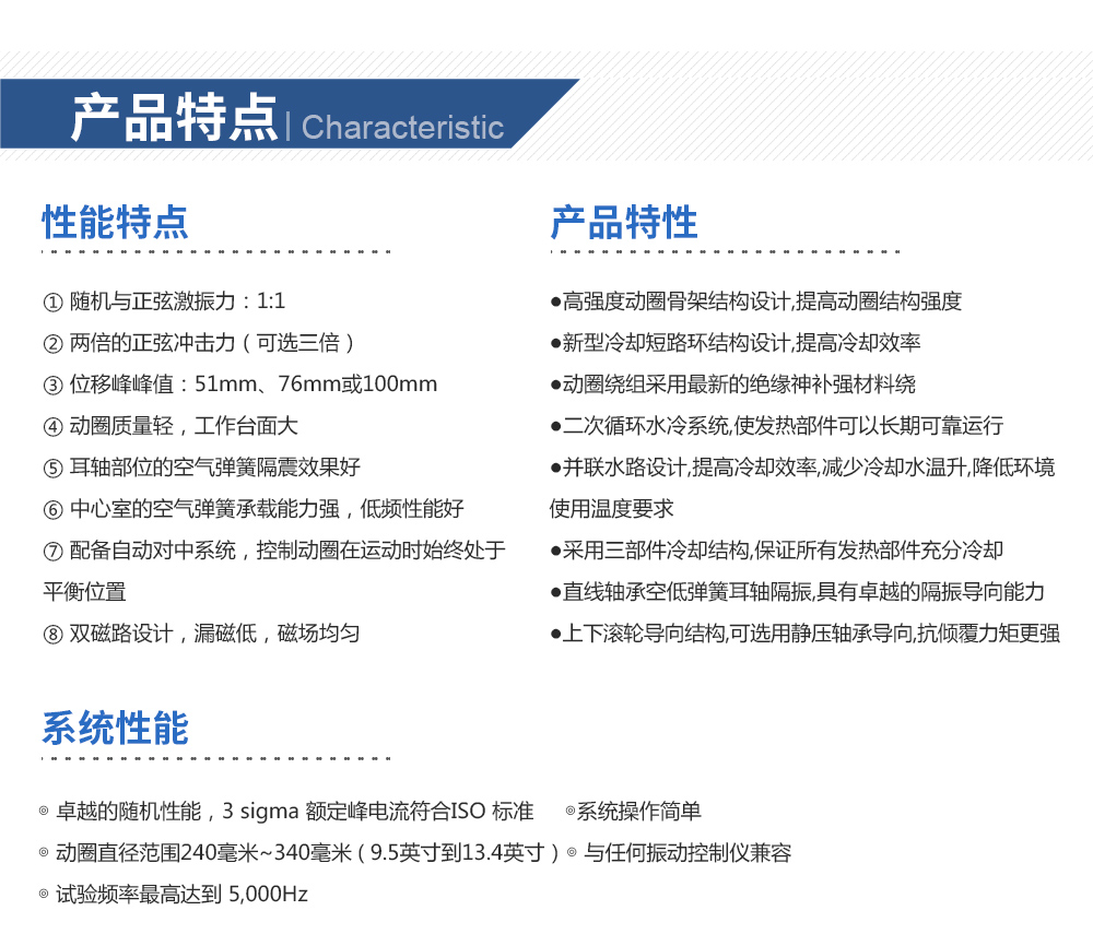 用途:水冷臺電動試驗系統,推力大,承載能力強,冷卻效率高??煞謩e完成三軸向的正弦振動試驗、寬帶隨機振動試驗以及經典(半正弦、梯形、后峰齒)脈沖和沖擊響應譜試驗。